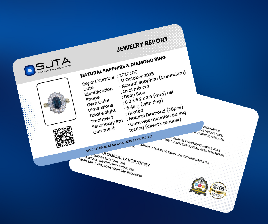 Jewelry ID Card adalah layanan identifikasi batu permata untuk batu yang sudah terpasang pada perhiasan. Pengujian dilakukan tanpa melepas batu dari perhiasan atas permintaan klien. Tim SJTA berhak menolak proses identifikasi apabila desain atau pemasangan perhiasan menghambat pengujian yang akurat.
